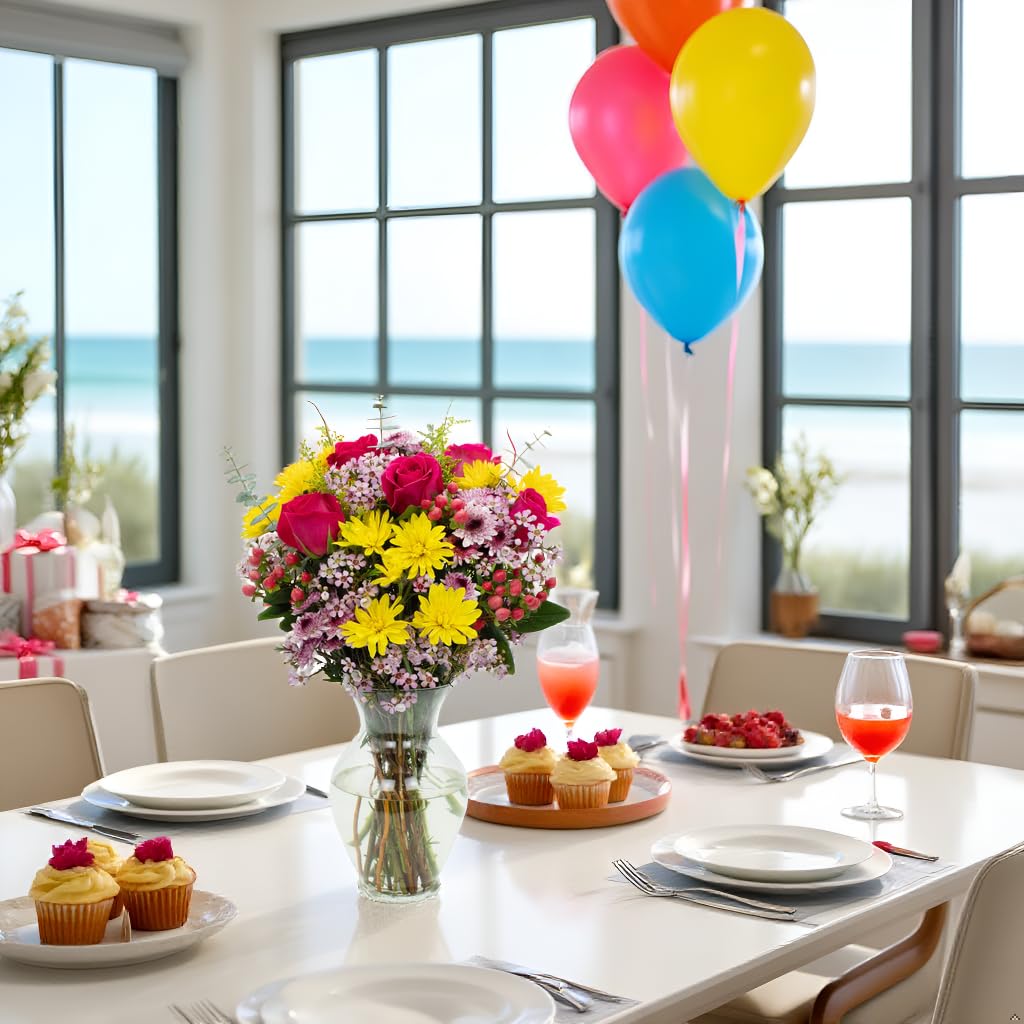 Celebrate the beauty of the season with this fresh Easter bouquet, thoughtfully designed with a soft, garden-inspired palette. Featuring pink roses, solidago, waxflower, pompoms, hypericum, curly willow, and eucalyptus, this arrangement offers a balanced mix of color, texture, and natural movement. Each stem is carefully selected and shipped fresh in protective packaging to ensure quality upon arrival. A clear glass vase is included for easy, ready to display enjoyment. Perfect for Easter gatherings, spring décor, or thoughtful gifting, this bouquet brings a light, cheerful touch to any space. For best results, trim stems and place in fresh water upon arrival.